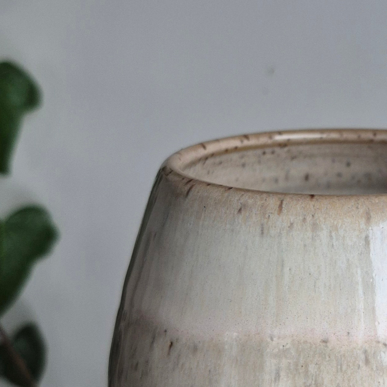 Puodeliai glazūruojami šviesia glazūra su taškeliais, kurios ryškumas gali varijuoti.